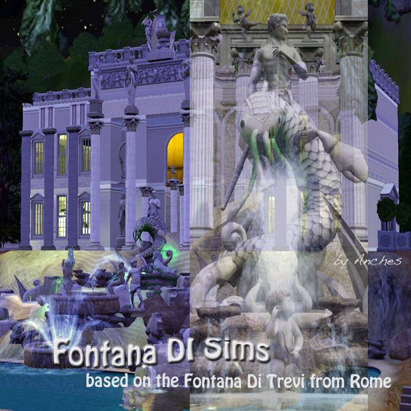 Der Brunnen "FONTANA DI SIMS" ist ein Gemeinschafts-Grundstück aus Episode 14 meiner Don Lotario Story. Eine Szene spielt da in Rom und ich habe versucht den "Fontana Di Trevi" nachzubauen. Er ist zwar im Original total eingebaut, aber ich wollte nicht so ein großes Grundstück verwenden, deshalb habe ich die nicht eingebaute Variante genommen. Ich hoffe er gefällt euch trotzdem.