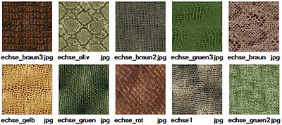 Musterset Schlangen- und Echsenleder für Kleidung, andere Textilien und Möbeldesign. Insgesamt 10 fotorealistische Muster für Die Sims 3