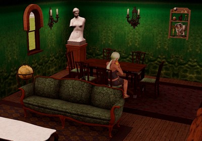 Dieses etwas düstere Haus eignet sich gut als Heim für unheimliche Gestalten oder ältere Sims. Der Innenbereich ist überwiegend in grün gehalten und in der ersten Etage kann auch ein Teenager untergebracht werden.