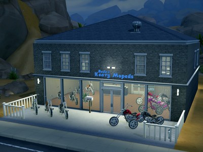 Business Lot 30×20, Sim Haushalt Bodo Fetzer + Ladenschild „Bodo’s Heavy Mopeds“