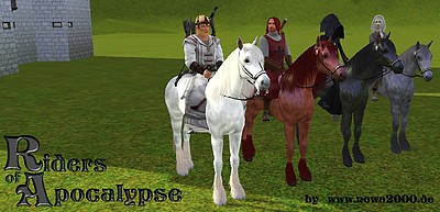 Die vier Reiter der Apokalypse als Sims 3 Haushalt sind als Gruppe oder auch einzeln downloadbar und würden gern in Riders Castle wohnen.