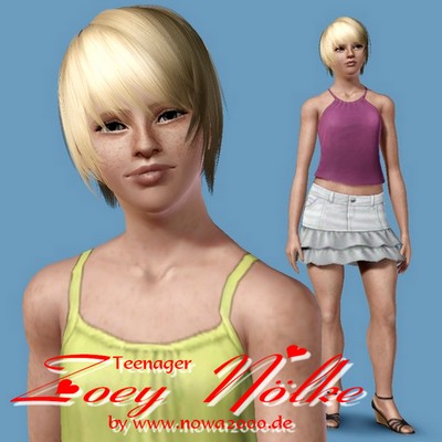 Zoey Noelke ist ein fröhliches und musikalisches Teenager Sim-Mädchen mit dem Herz auf dem rechten Fleck, das auch gern lacht.