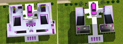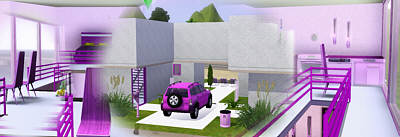 Die gesamte Einrichtung ist in lila und rosa gehalten und im Zentrum befindet sich ein grosser TV Empfänger mit Plätzen für jedes Familienmitglied davor. Direkt vor der Haustür parkt das Fahrzeug der Familie.